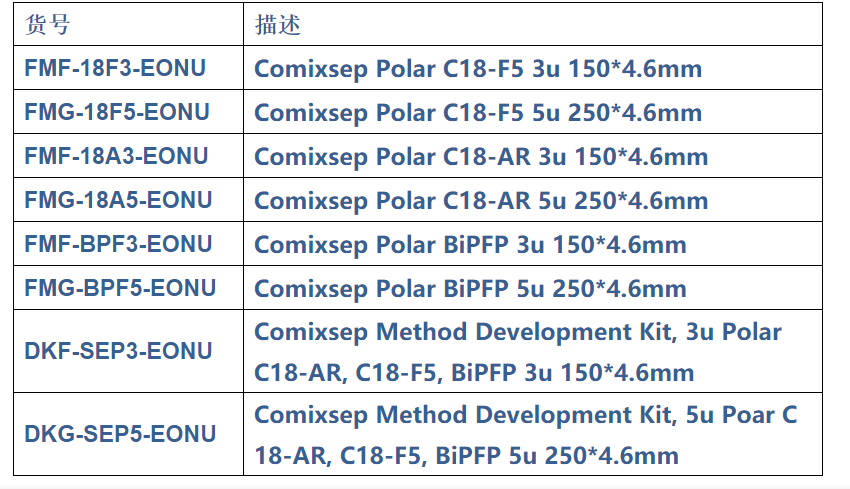 部分常用規(guī)格的單款色譜柱和方法包貨號(hào)和描述如下: