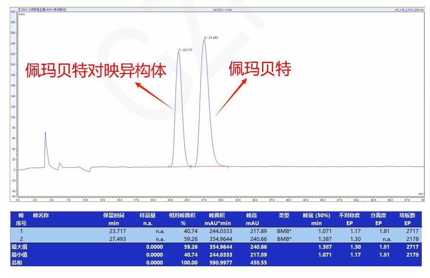 App ID: FLM-B250001 佩瑪貝特及其對映異構(gòu)體的手性拆分 方法 1: 色譜柱:Chiral INA 5μm 250*4.6mm (貨號:FMG-JY5-I01) 流動相:正相(咨詢) 流速:0.8 mL/min 檢測波長:230nm 柱溫:25℃ 樣品濃度:1mg/ml 稀釋劑:甲醇 進樣量:10ul 色譜圖: