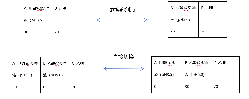 Part 2 三元泵相比二元泵的優(yōu)勢 1. 便于對比不同種類或pH的流動相 在開發(fā)一個新的分析方法時,通常需要篩選不同的溶劑組合以找到最佳分離效果。例如,可能需要嘗試: 不同pH的緩沖液:比如甲酸銨緩沖液(pH3.5)和乙酸銨緩沖液(pH 5.0)。 不同的有機相:比如甲醇和乙腈,它們的洗脫強度和選擇性不同。 對于二元泵,如果你想從“乙腈-甲酸銨緩沖液(pH3.5)”切換到“乙腈-乙酸銨緩沖液(pH 5.0)”,你必須手動更換泵B的溶劑瓶,并從泵A的瓶子中倒掉舊的緩沖液,更換新的緩沖液。這需要停機、沖洗系統(tǒng)、重新平衡,非常耗時且容易出錯(如產(chǎn)生氣泡、殘留污染)。